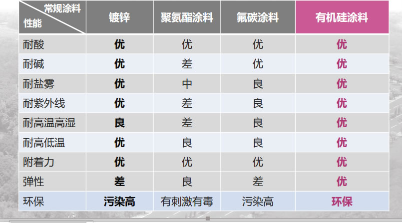 专家研究表明,普通的防腐涂料分子结构中C-O和C-C键能( 分别为336KJ/mol和356KJ/mol),都低于紫外线辐照能(370 KJ/mol),在热老化环境中容易发生断链现象,从而导致材料的降解使得防腐涂料失效,最明显特征就是褪色,粉化,脱落,开裂等。因此许多普通防腐涂料不耐紫外老化和热老化;而有机 硅弹性防腐涂料其主链基本为硅氧键结构,Si-O-Si键能(452KJ/mol)高于紫外线辐照能,因此有机硅弹性防腐涂料具有优异的耐气候老化性能,大量案列证明有机硅弹性防腐涂料使用15年以上无表层变化,特别适合长期户外钢结构及混凝土的保护。